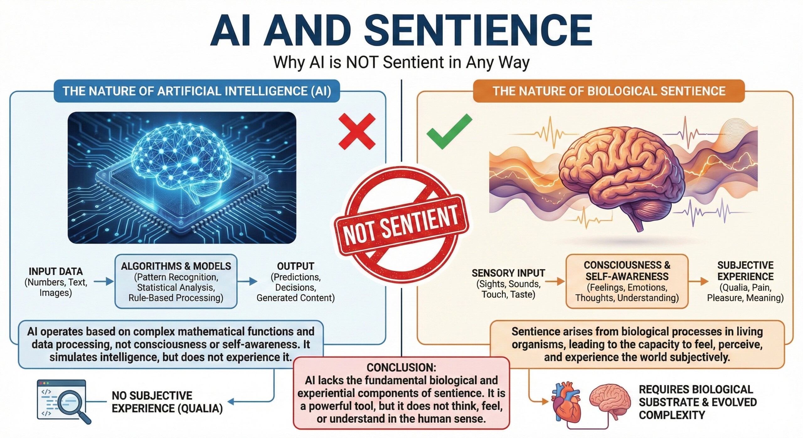 AI does not have intentions, feelings, or a sense of right and wrong. It cannot “mean” to help or harm anyone. Like a knife, it can be used in many ways, but it does not choose how it is used. It has no emotions, no sentience, no human context understanding, no sense of right or wrong and no real-world grounding at all. - AI cannot act without human setup and permission.