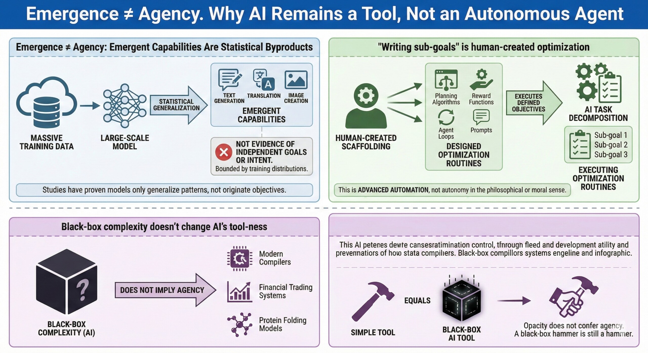 Many powerful tools are black boxes like Modern compilers, Deep optimization solvers, Financial trading systems, or Protein folding models. That opacity does not confer or imply agency. A black-box hammer is still a hammer.