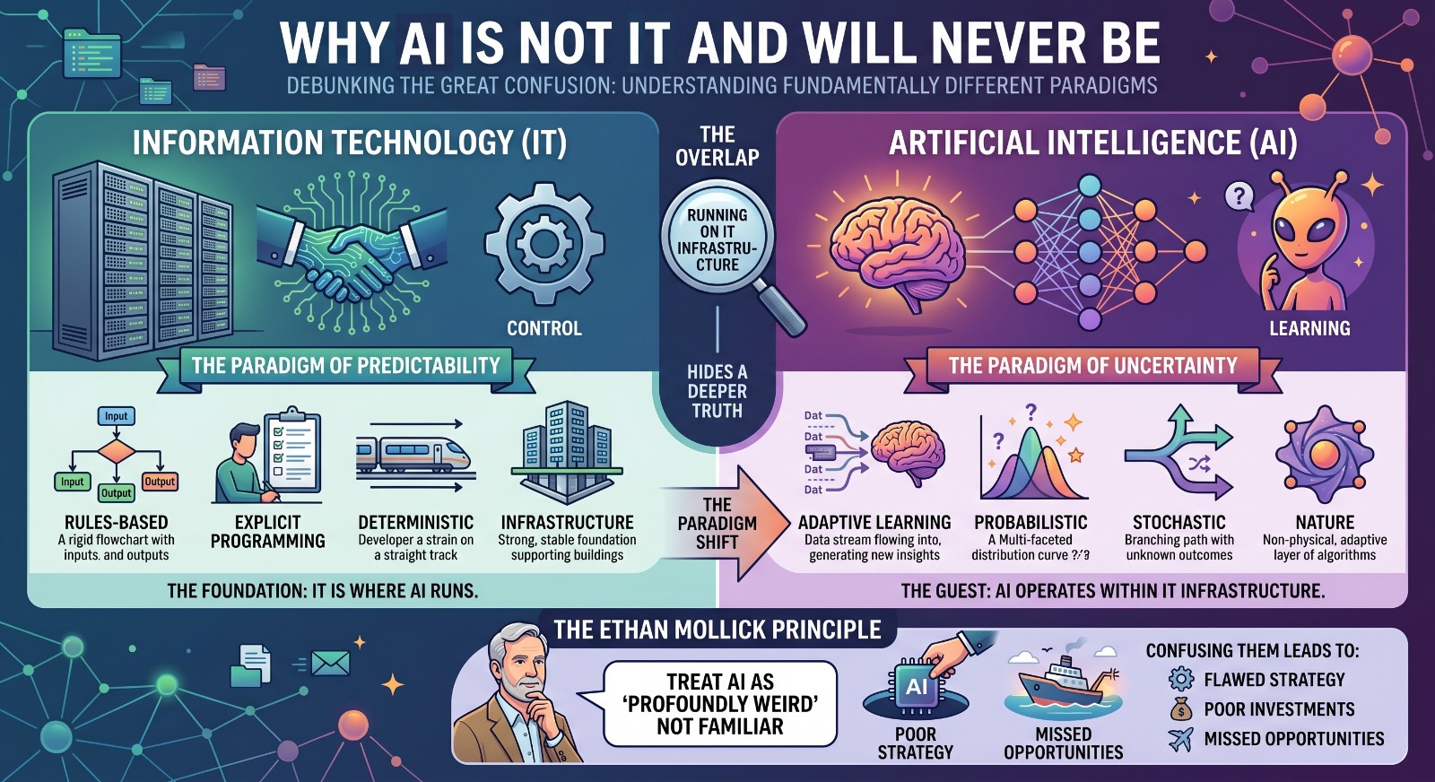 IT and AI are fundamentally different paradigms. One is built on control and predictability, while the other is built on learning and uncertainty. Confusing them leads not just to conceptual errors but to flawed strategy, poor investments, and missed opportunities.