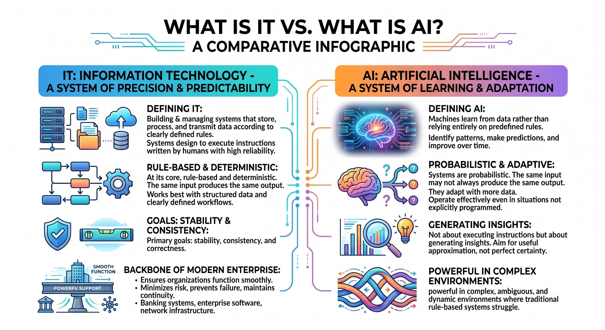 At its core, IT is rule based and deterministic. The same input produces the same output. It works best with structured data and clearly defined workflows. Its primary goals are stability, consistency, and correctness.