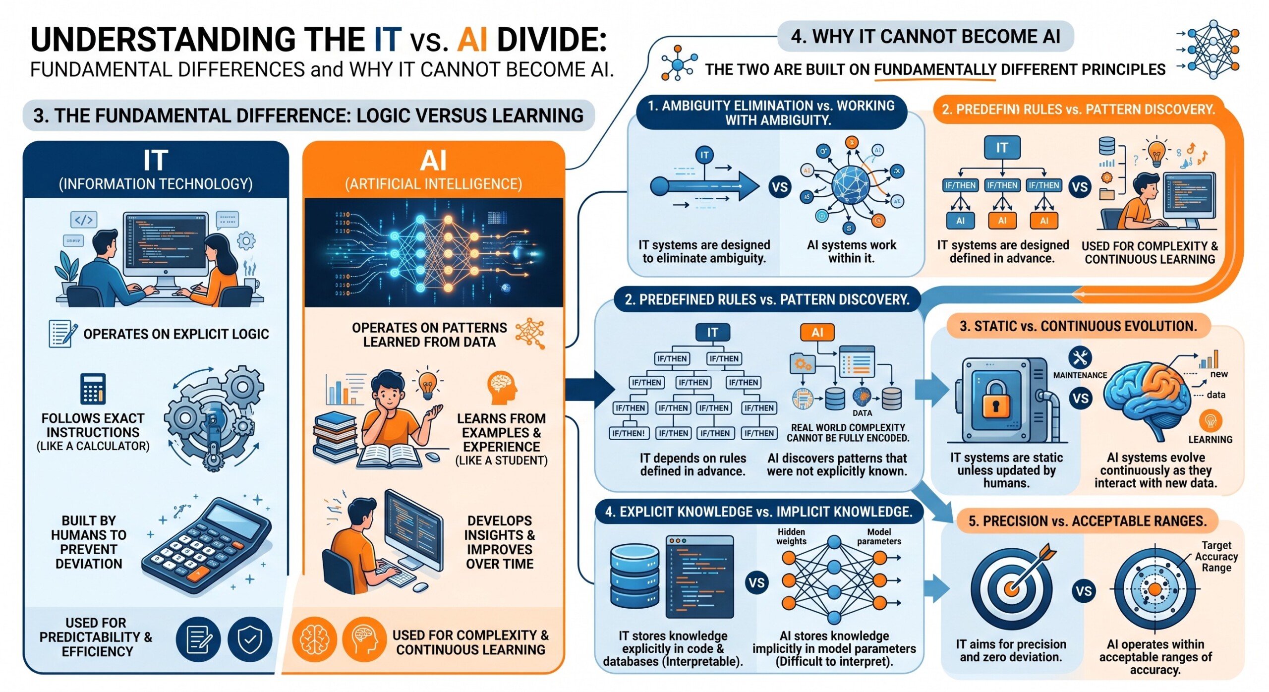 IT systems are designed to eliminate ambiguity, while AI systems work within it. IT depends on rules defined in advance, while AI discovers patterns that were not explicitly known. Even with millions of rules, an IT system cannot replicate the flexibility of a learning model because real world complexity cannot be fully encoded.