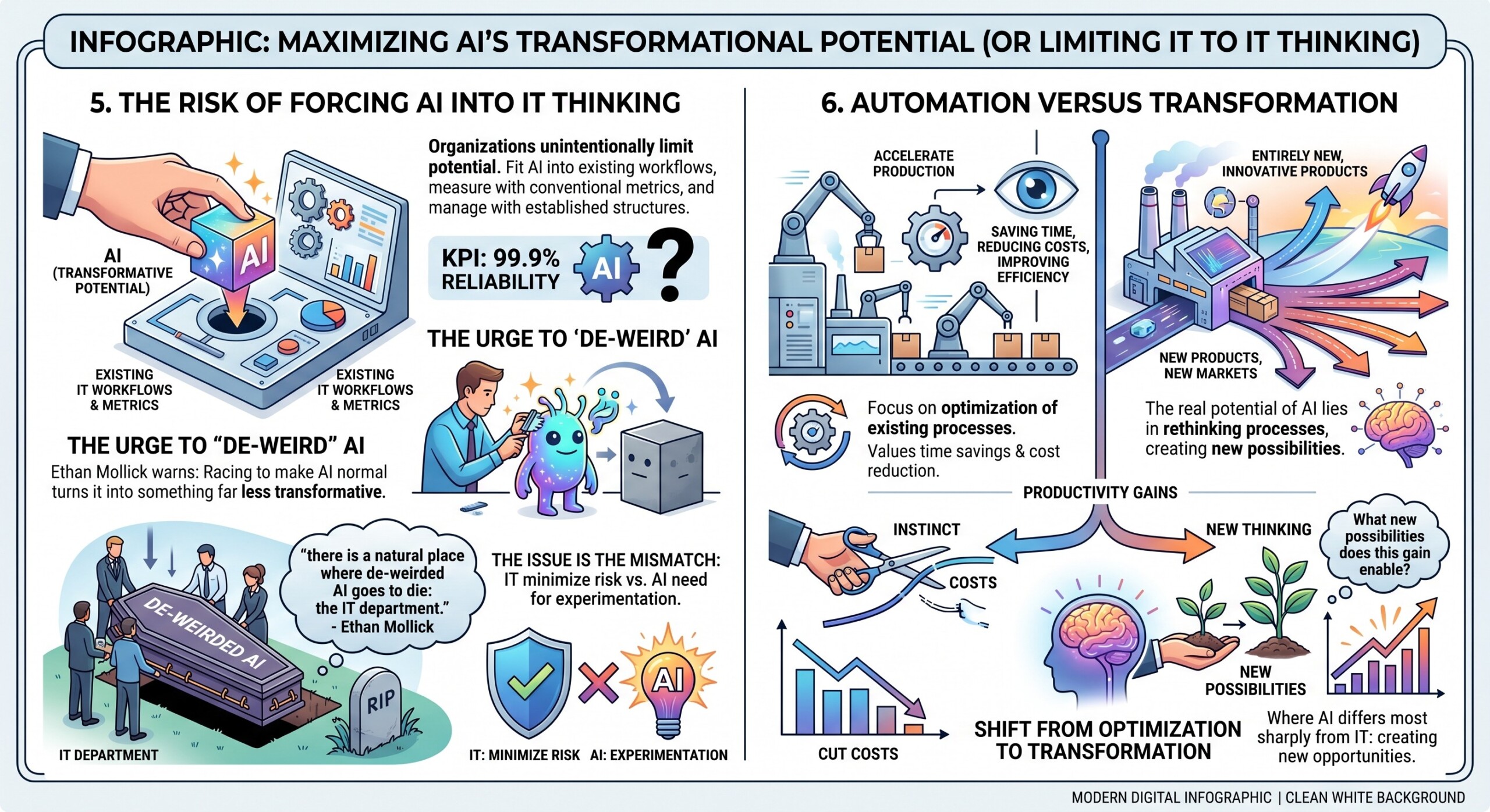 He also observes that there is a natural place where this process leads. In his words, “there is a natural place where de-weirded AI goes to die: the IT department.” The issue is not with IT itself but with the mismatch between IT’s mandate to minimize risk and AI’s need for experimentation.