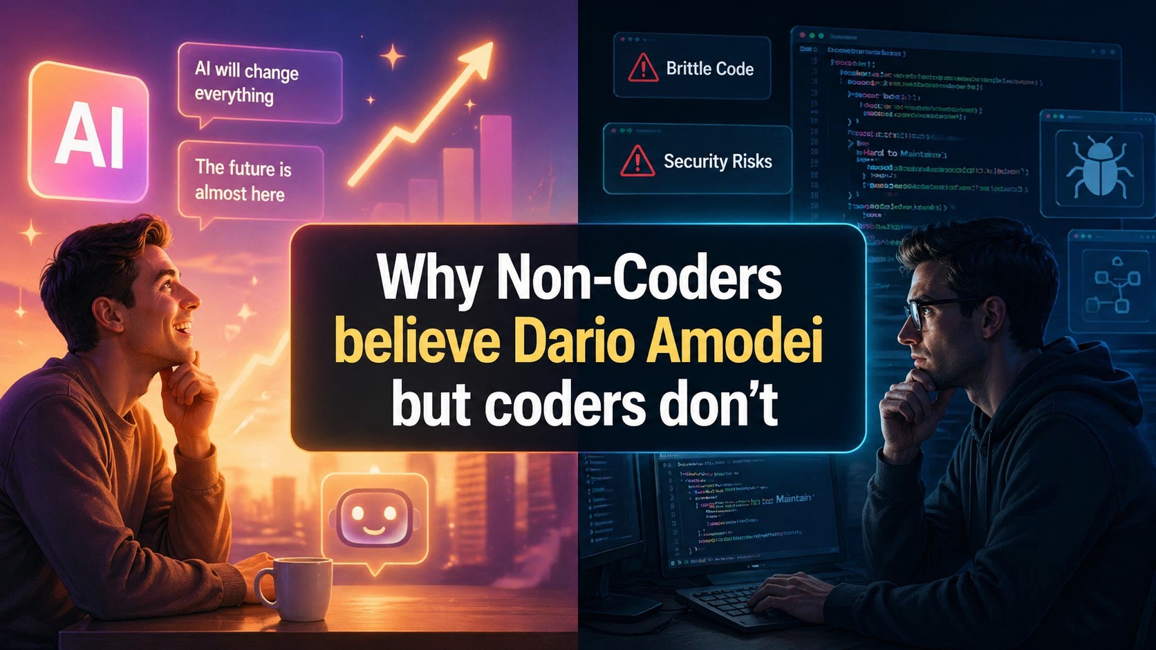 - Non-coders believe Dario Amodei because they see AI coding as a spectacular shortcut. Coders are skeptical because they see the hidden work: architecture, safety, backups, debugging, permissions, maintainability, and long-term responsibility.