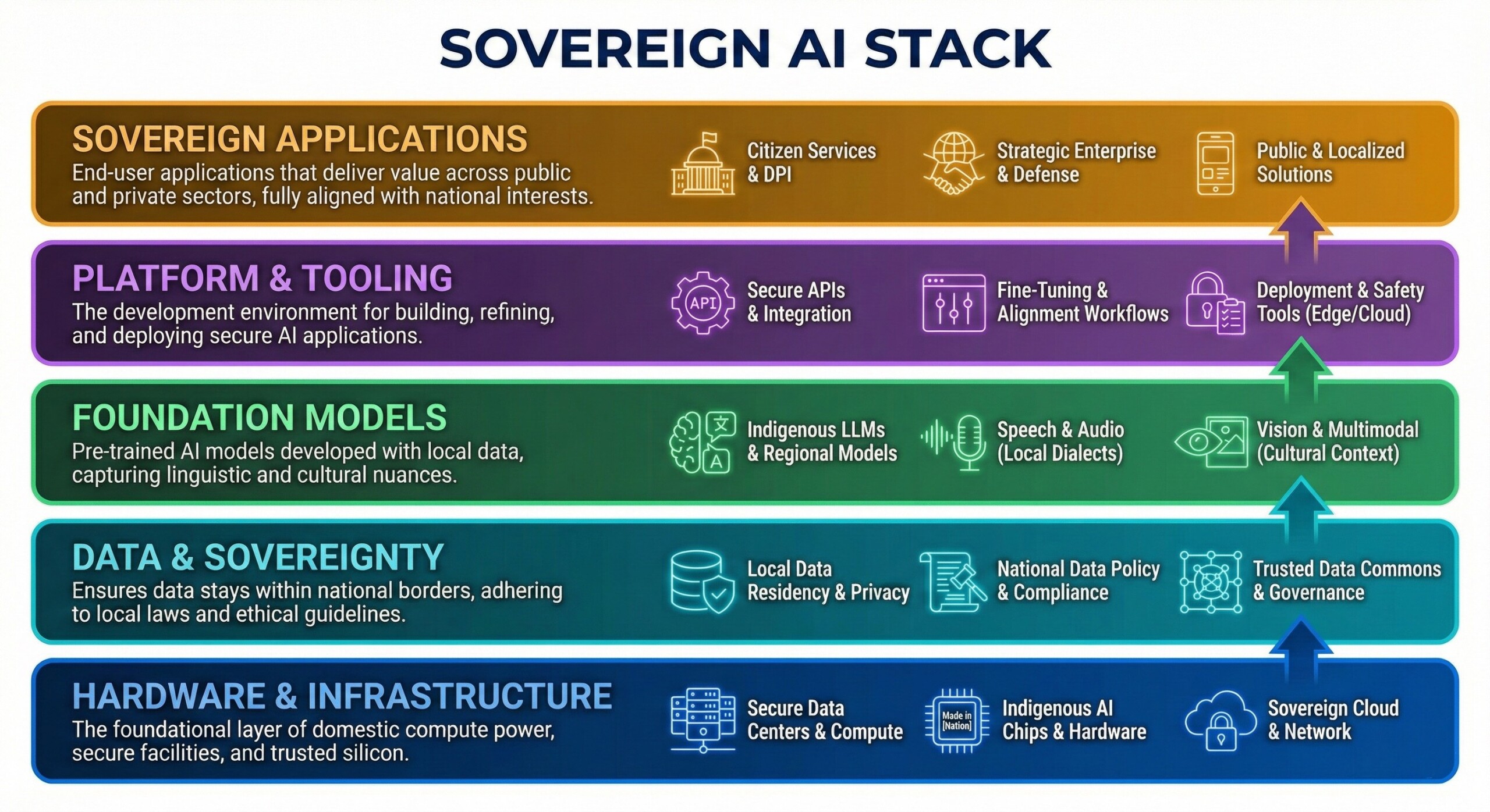 A Sovereign AI Stack aligns national compute, data sovereignty, foundation models, secure platforms, and citizen-facing applications into one trusted ecosystem. It ensures local control over infrastructure. It follows compliant data governance, culturally grounded models, safe deployment across cloud and edge. Its goal is real-world impact for public services, enterprises, and strategic national priorities.
