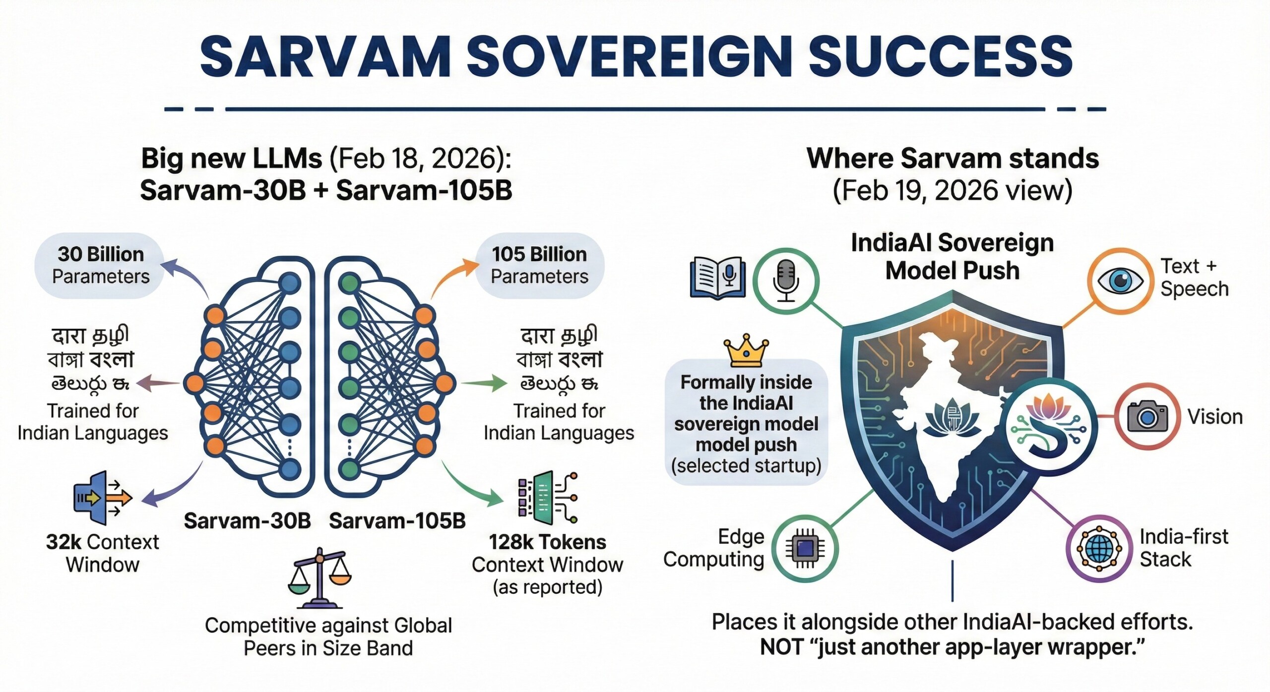 - Big new LLMs (Feb 18, 2026): Sarvam-30B + Sarvam-105B – Sarvam announced 30B and 105B parameter models trained for Indian languages; reporting 32k context for 30B and 128k tokens for 105B (as reported), and positioning them as competitive against several global peers in their size band.