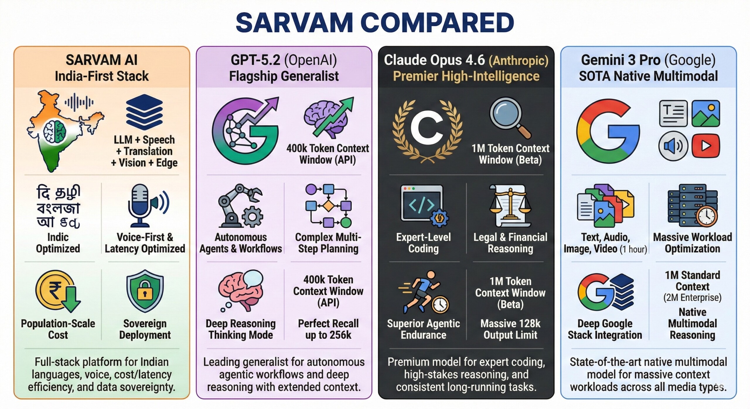 - Sarvam: India-first stack (LLM + speech + translation + vision + edge) optimized for Indic languages, voice, population-scale cost/latency, and sovereign deployment.