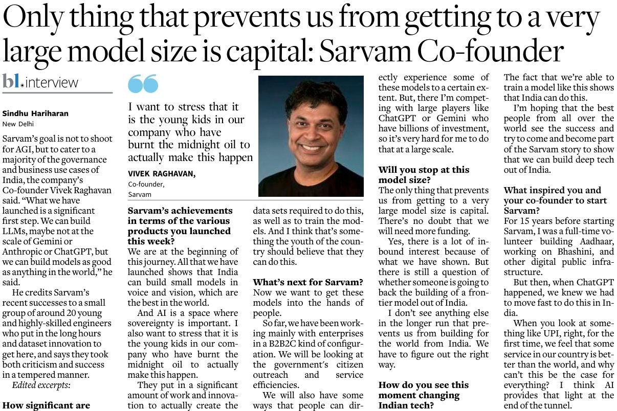 - Sovereign AI dream begins via Government selection: Apr 26, 2025 (IndiaAI Mission) – Sarvam announced it was selected by the Government of India under the IndiaAI Mission to build India’s sovereign LLM, “capable of reasoning, designed for voice, fluent in Indian languages,” intended for secure population-scale deployment.