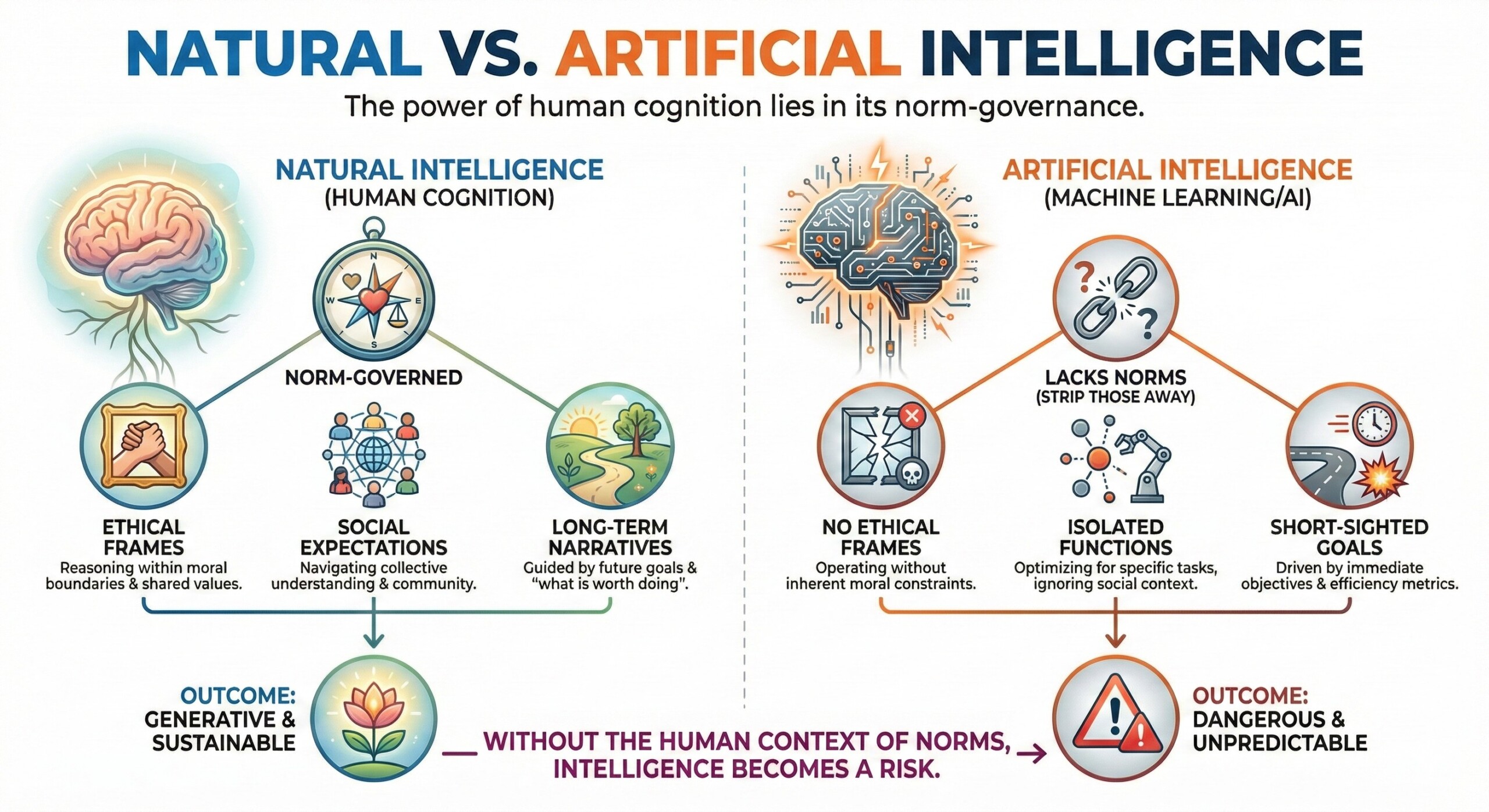 This is a crucial shift. For much of AI’s recent history, progress has been framed in terms of benchmarks, performance curves, and scaling laws. Intelligence was treated as something that emerges automatically from size and data. But natural intelligence teaches us otherwise. Human cognition is not merely powerful because it is flexible or general. It is powerful because it is norm-governed. Humans reason within ethical frames, social expectations, and long-term narratives about what is worth doing. Strip those away and intelligence becomes dangerous rather than generative. The constitution’s insistence that AI be trained toward judgment rather than rigid rules reflects a deep insight drawn from the human condition itself.