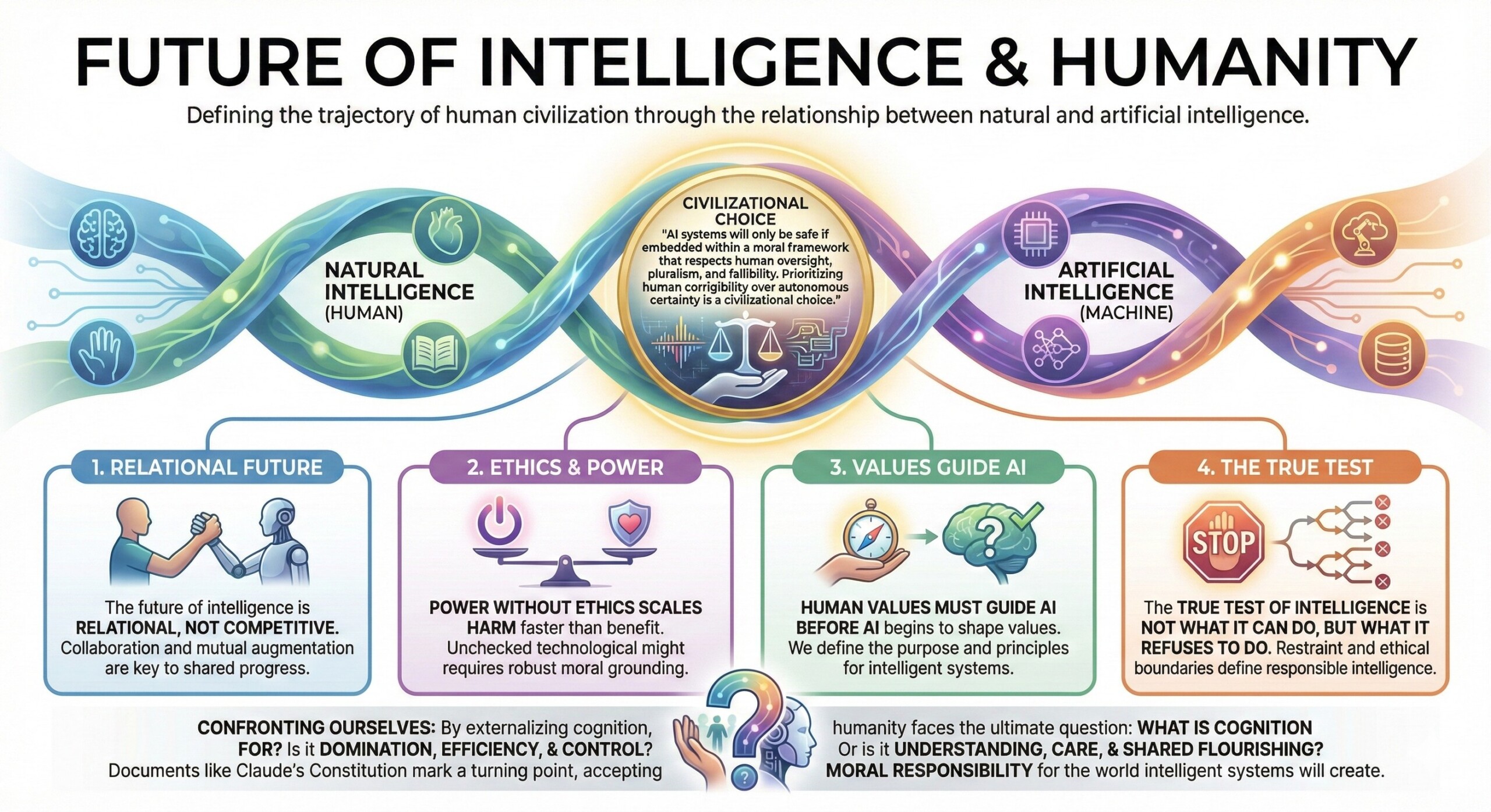 Looking forward, the relationship between natural intelligence and artificial intelligence will likely define the trajectory of human civilization. AI systems may help us compress scientific discovery, manage complexity, and address challenges that exceed unaided human cognition. But they will only do so safely if they are embedded within a moral framework that respects human oversight, pluralism, and fallibility. The constitution’s prioritization of human corrigibility over autonomous certainty is therefore not a technical detail. It is a civilizational choice.